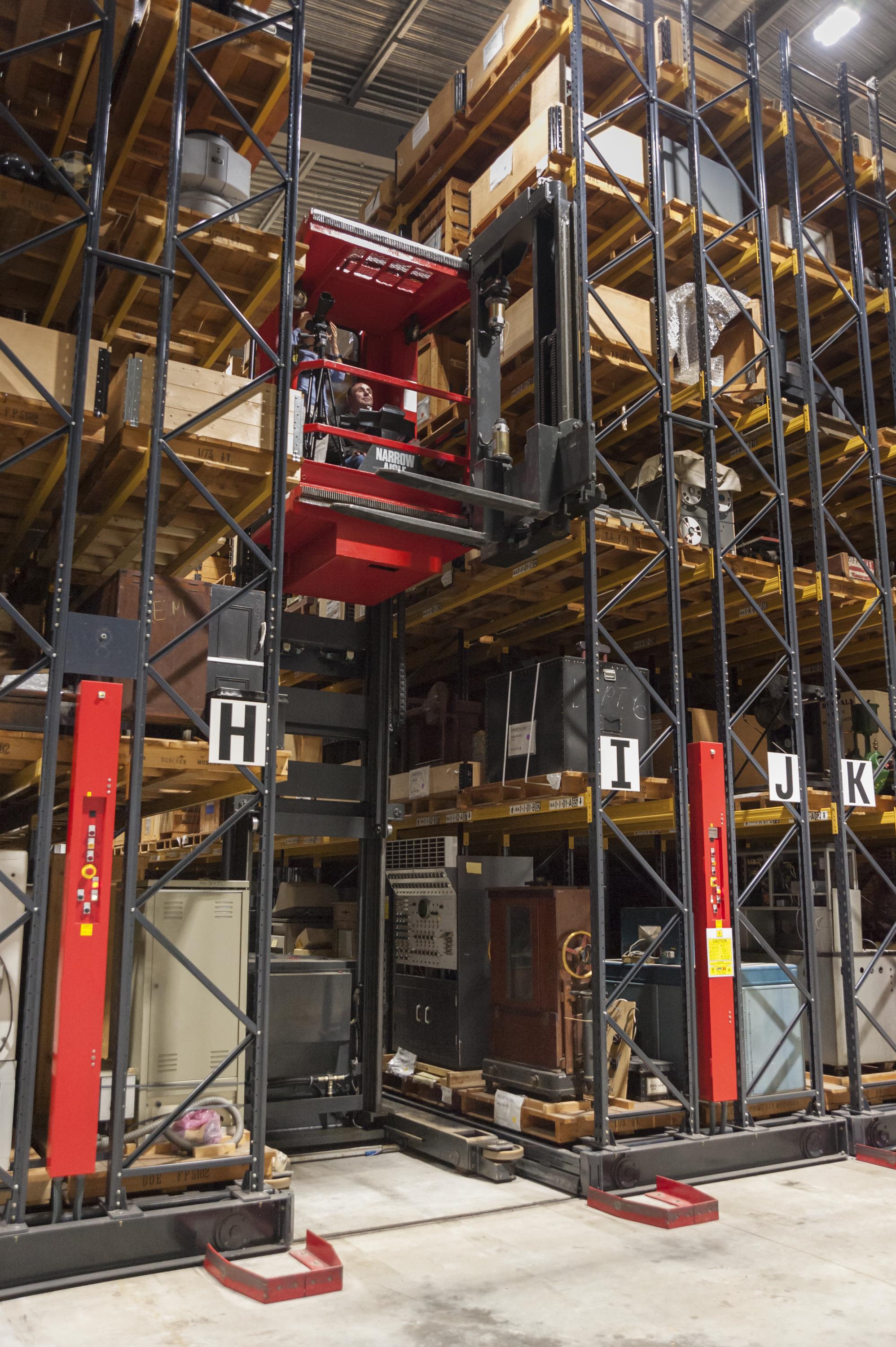 Luckily the storage shelves split right in front of the painting and the space was wide enough to allow us to drive back into the aisle giving us a prime focal length.