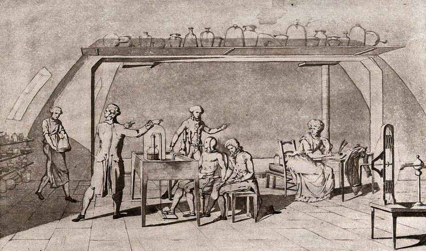 This scene features Antoine Lavoisier, in wig and tailcoat, stood at the table. A physician (possibly Scotsman Hugh Gillan) is taking the pulse of a topless man (chemist Armand Séguin), who is wearing a copper face mask attached to a circulatory breathing apparatus while operating a pedal. Paulze can be seen note-taking.