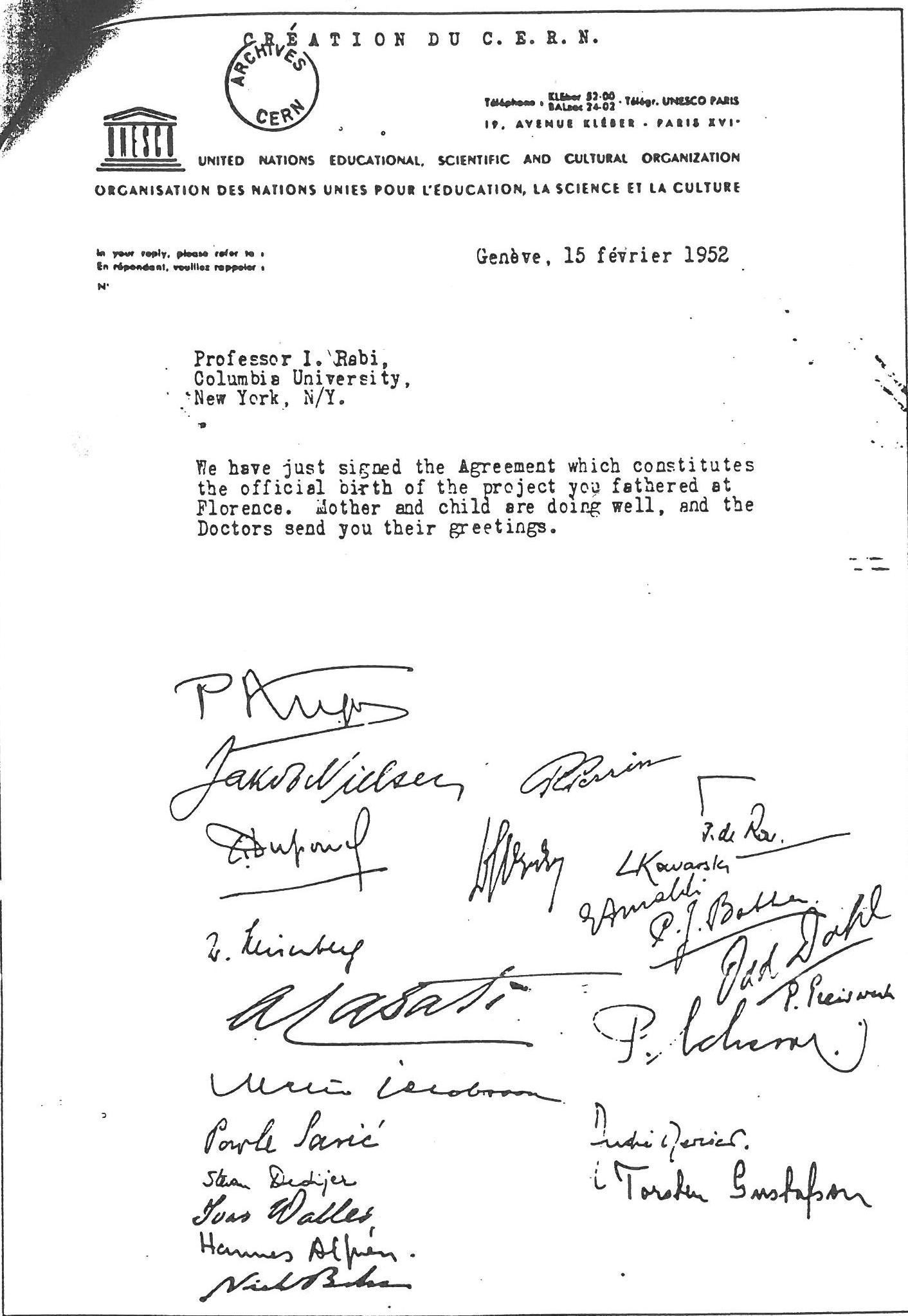 The next day, the signed agreement was telegrammed to Rabi, informing him of the “birth of the project you fathered in Florence”. The convention was signed on the 1st July, 1953 and CERN became an official organisation just over a year later.