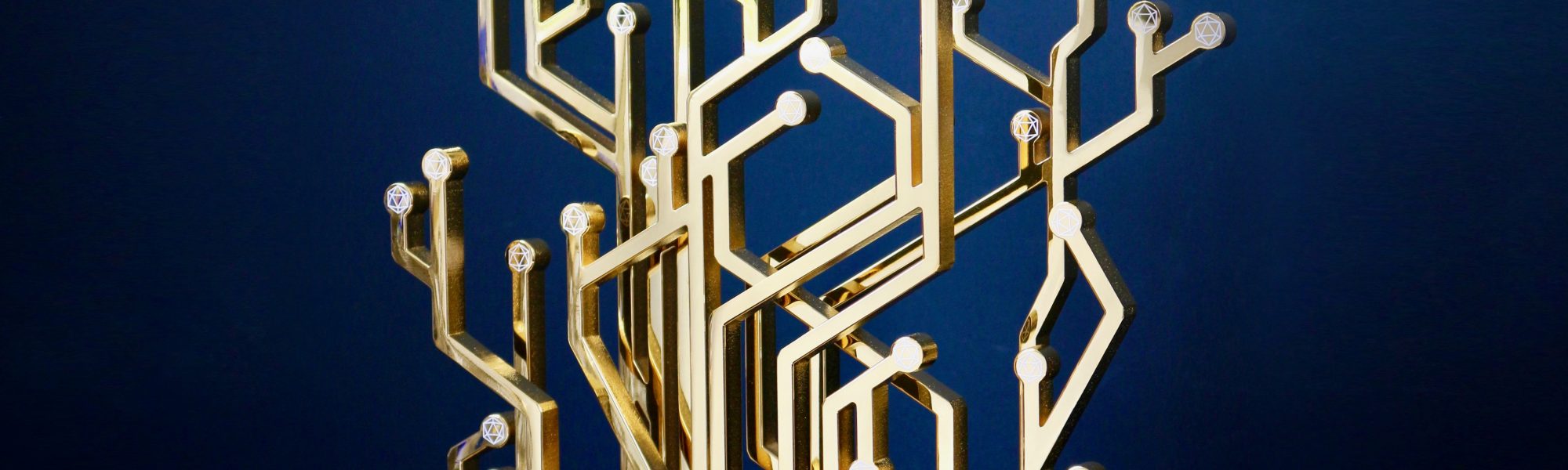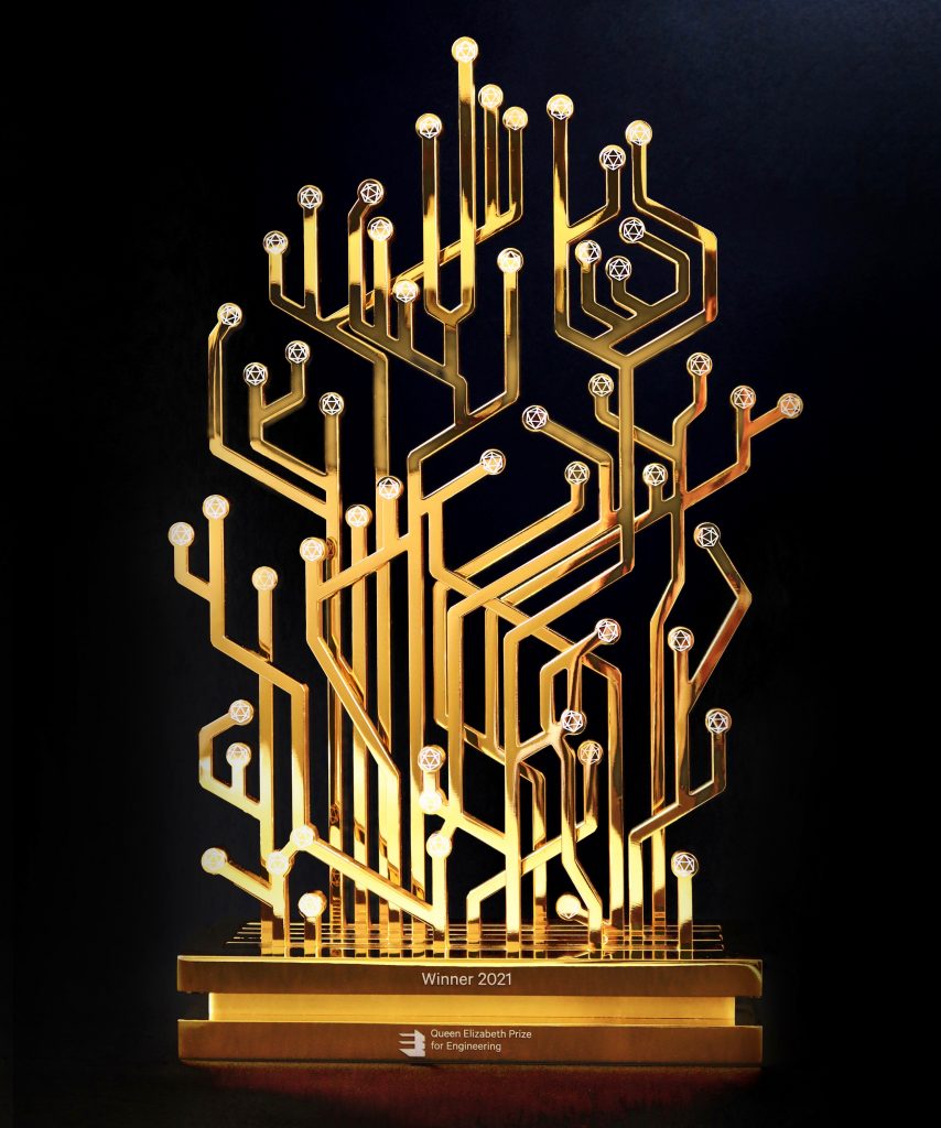 The 2021 QEPrize recognised the global impact of light emitting diode (LED) technology, an invention that has forever impacted the sustainable use of energy around the globe. The trophy awarded to the developers of LEDs was designed by 20-year-old design student Hannah Goldsmith, who drew inspiration from the circuit boards on which much engineering is done.