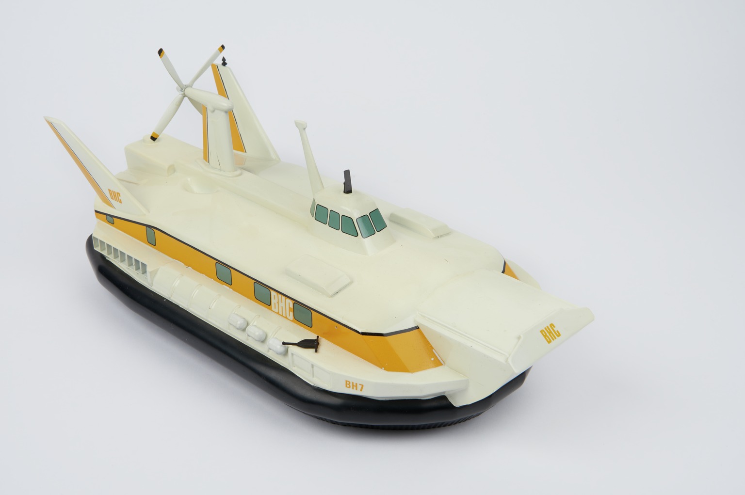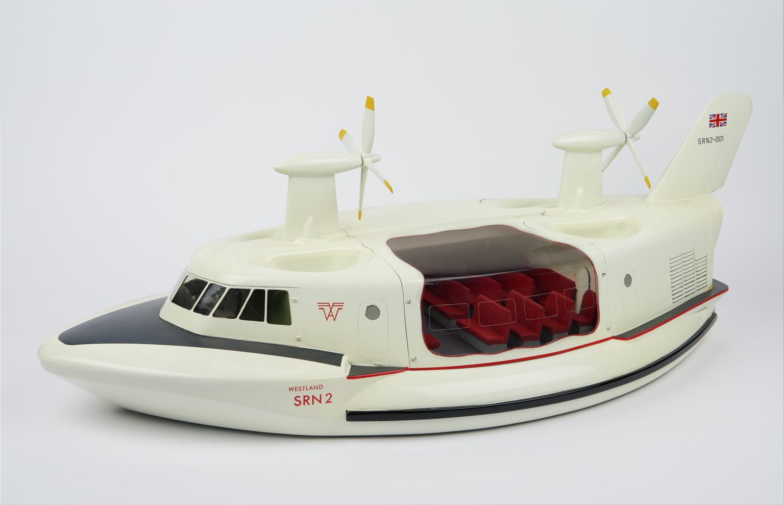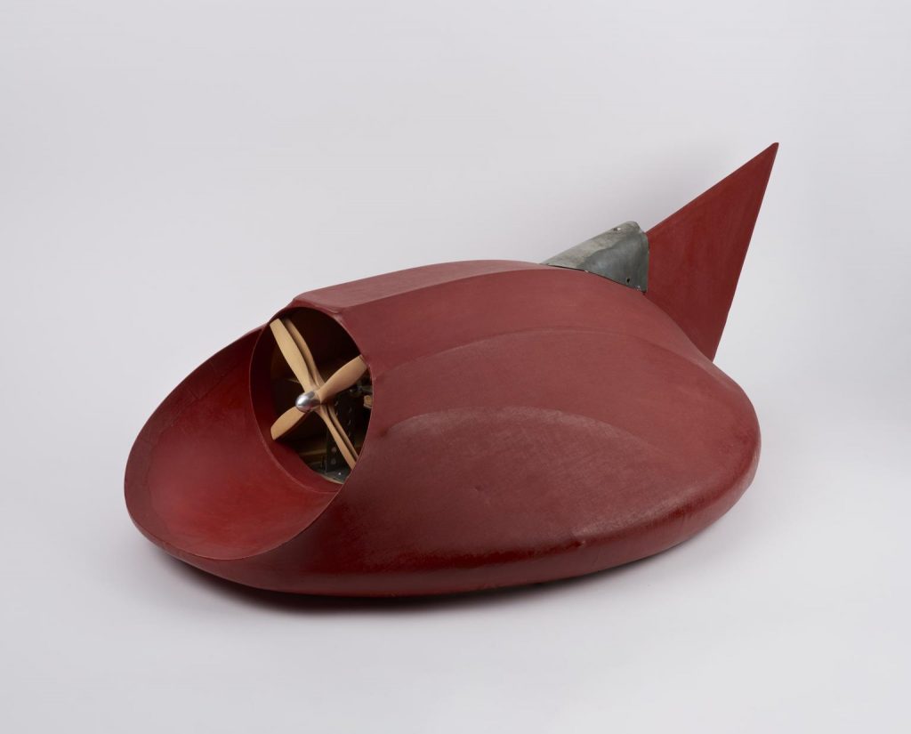 But Cockerell’s own hovercraft had flown some four years previously. Having acquired a small shipyard on the Norfolk Broads, Cockerell experimented with the improvised kit before completing an experimental prototype model (using model aircraft-type construction of nylon or silk over balsa wood with a glow-plug model aero engine) which he tested by tethering it to a rowing boat at his yard and flying it around. This prototype is also in the museum’s collection and is on show in the Flight gallery.