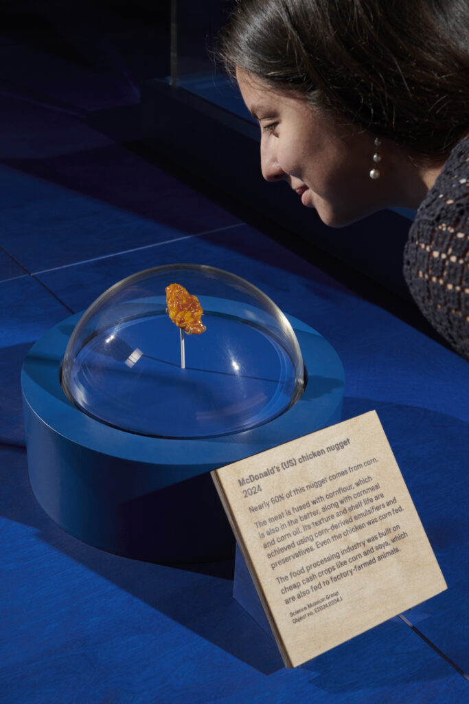 Items on display range from a vial of acide margarique, a fatty substance developed by French chemist Michel Chevreul that led to margarine, to a Chicken McNugget, with the hidden environmental costs behind industrially produced foods laid bare – from cash crops such as corn and soya to intensively produced meat and processed foods.