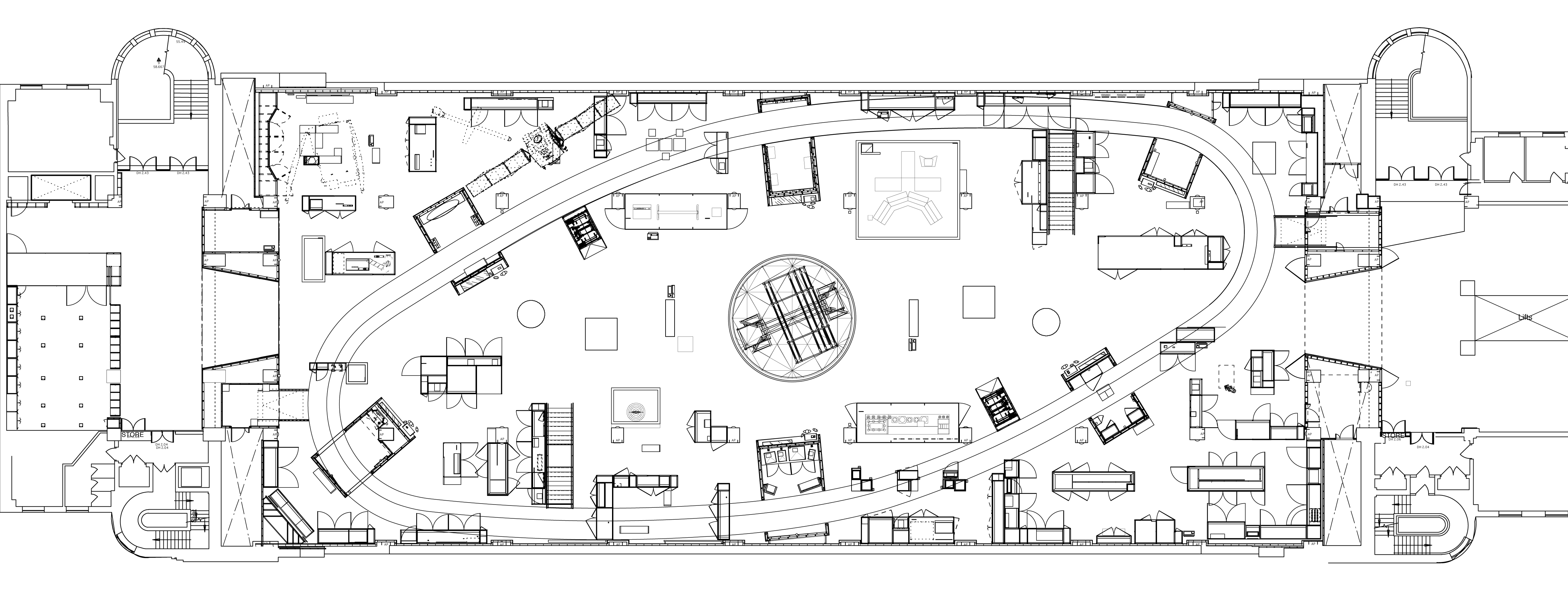 From the centre you can see that the gallery is divided into six networks – each one telling stories from a specific section of communication technology. Placed around the outsides of the gallery, similar to the idea of a town square or plaza, we placed large double height display cases. These display structures are designed to house a vast array of objects.