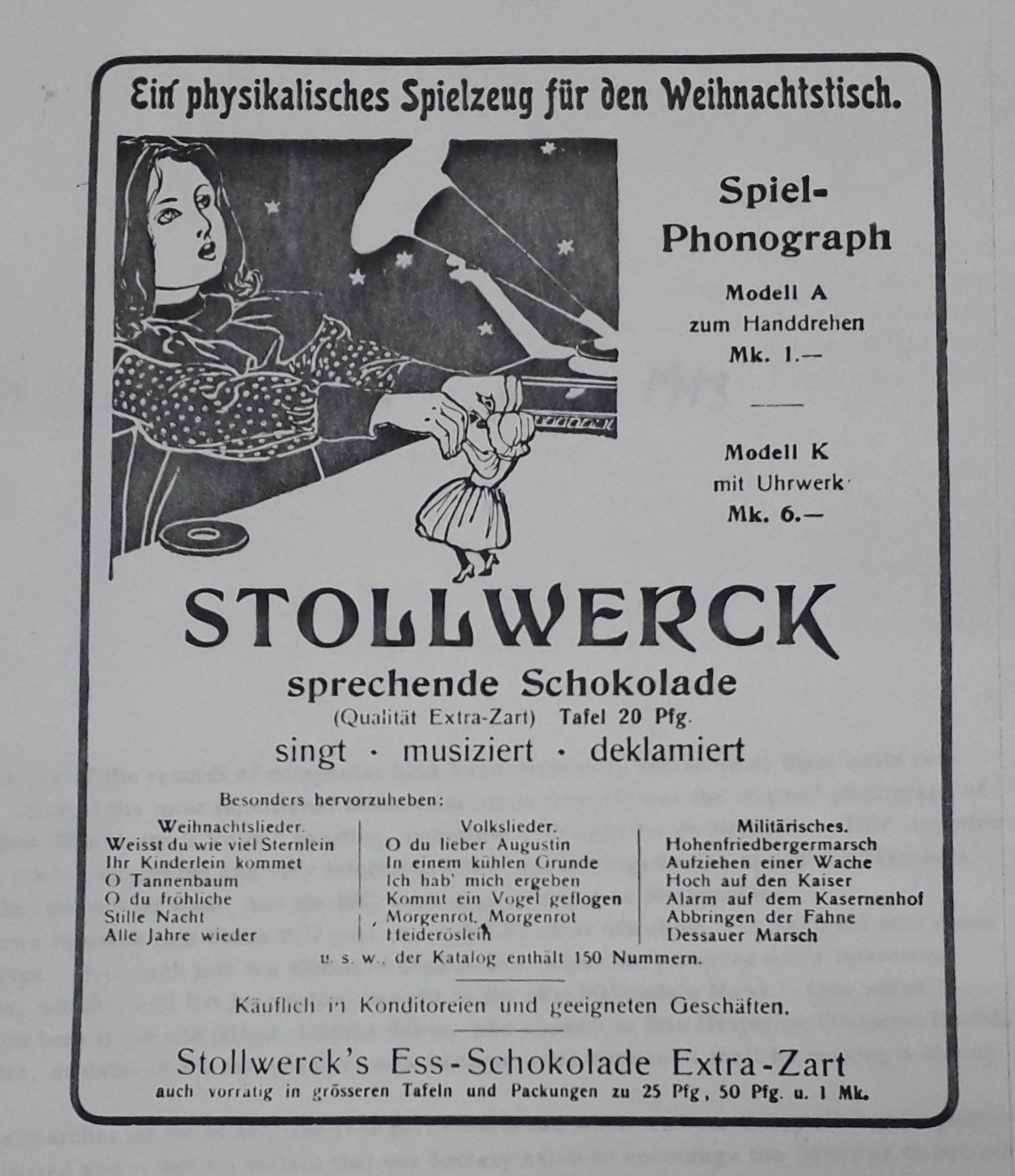 The discs were advertised as “Stollwerck talking chocolate”, an ideal gift for children who could eat the record once they were tired of listening to the song (a wax copy of the record was included as well, so that getting peckish wasn’t the end of the musical fun).