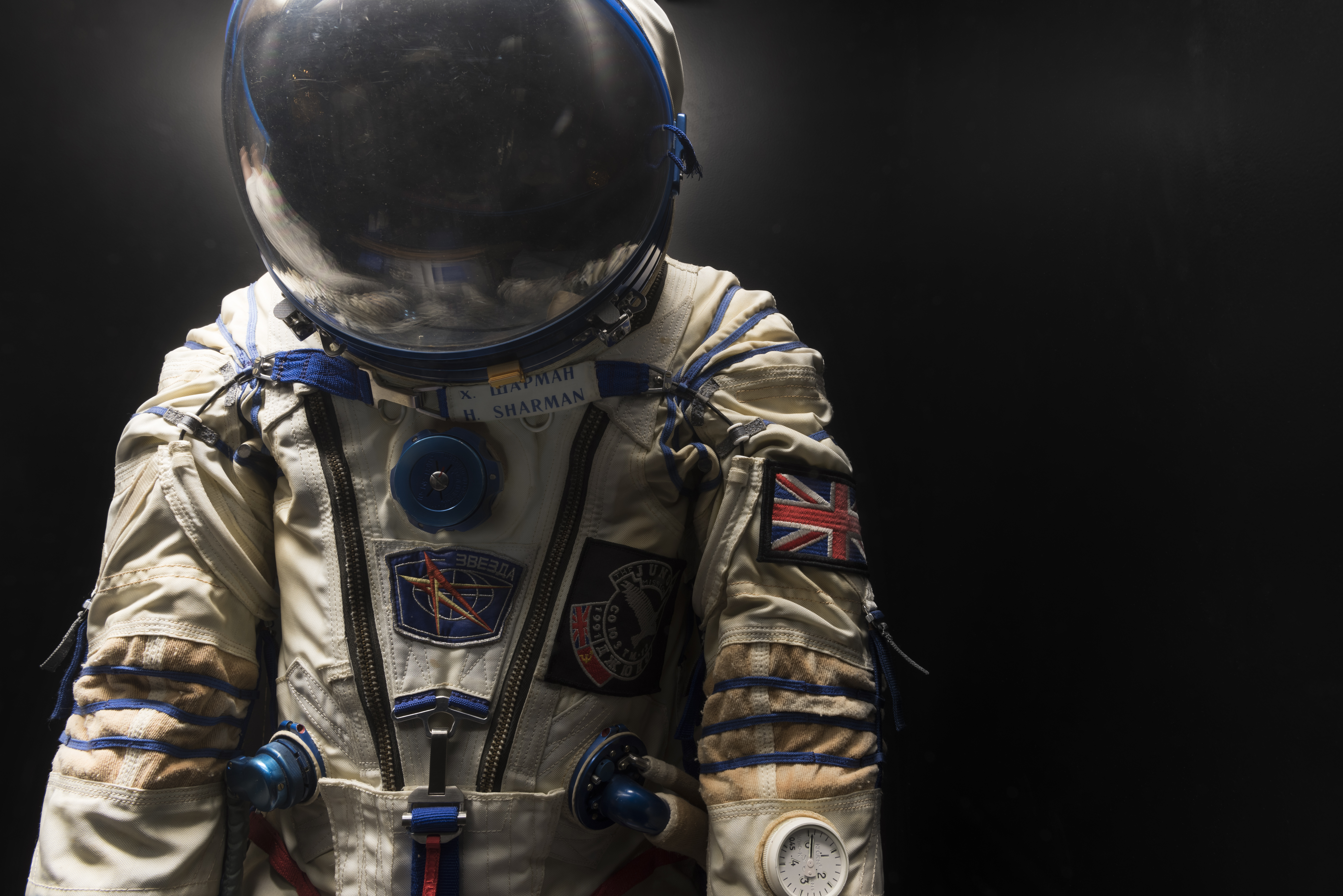 The world’s first spacesuit, SK-1 – orange, with a white helmet inscribed in red ‘CCCP’ – was worn in the first flight by Gagarin to the sixth by Valentina Tereshkova. Development of the SK-1 by Zvezda began in 1959 but Helen Sharman would wear a later design, the Sokol, which was developed more than a decade later in response to a tragedy.