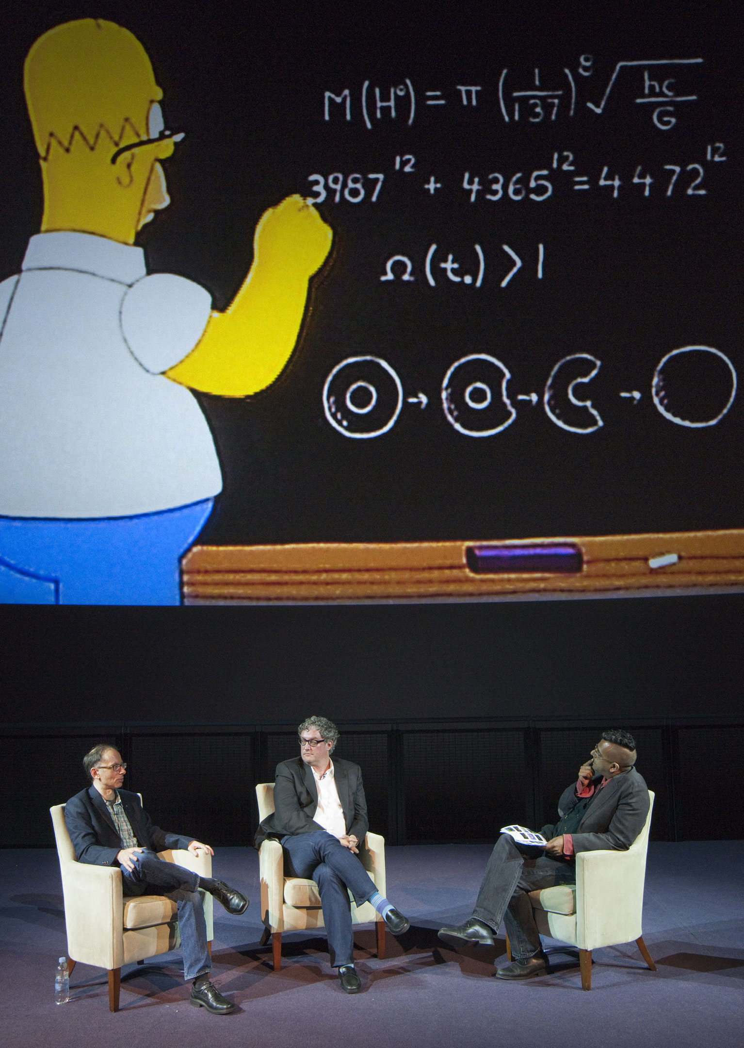 The evening was expertly compered by Simon Singh, author of The Simpsons and their Mathematical Secrets. He invited Al Jean and David X. Cohen to explain how and why they have regularly embellished episodes of both series with references to degree-level maths such as Fermatís Last Theorem or the Taxicab number.