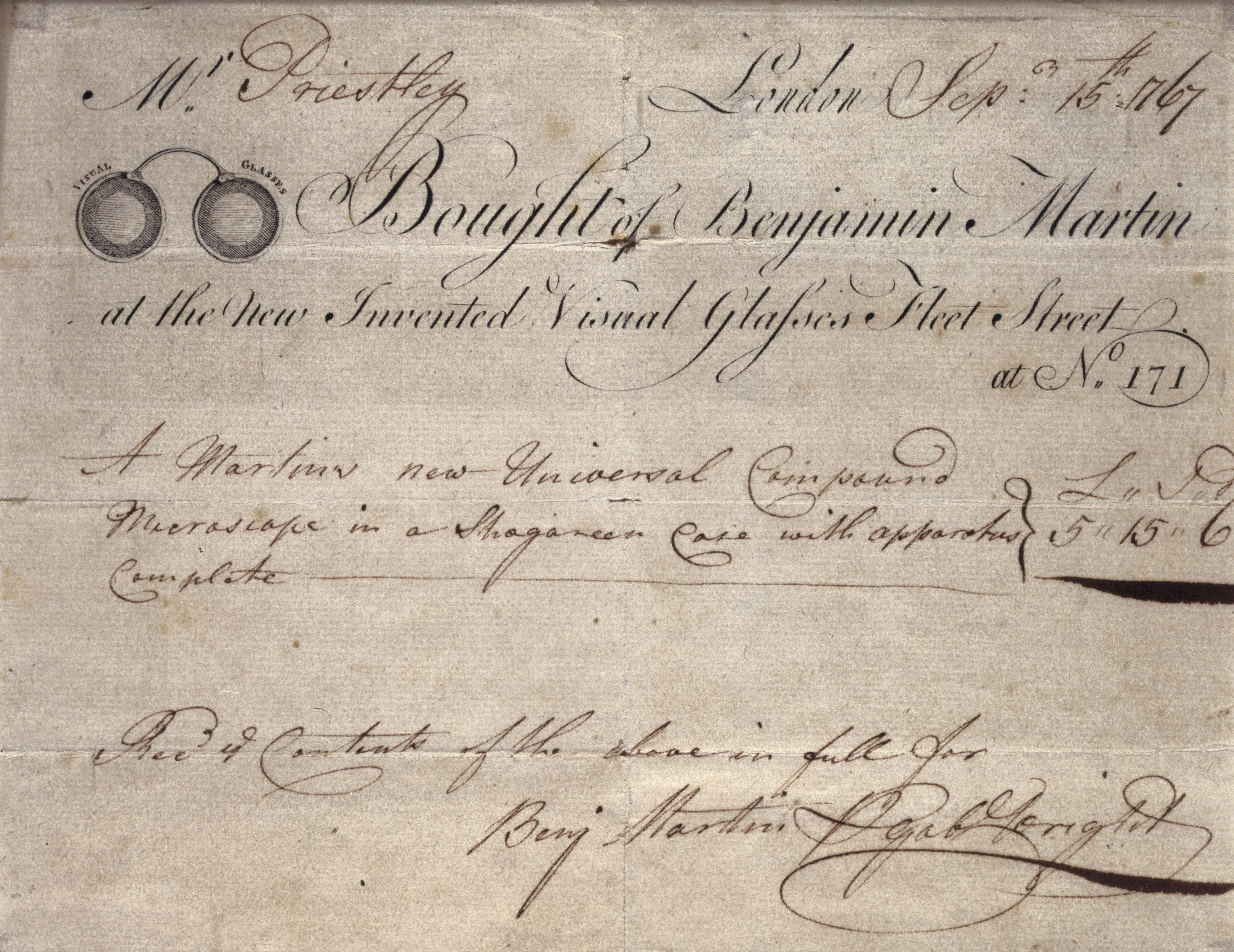 The Science Museum has in its collections the very same microscope. But, much more remarkably, the Museum also has Priestley’s original shop receipt.