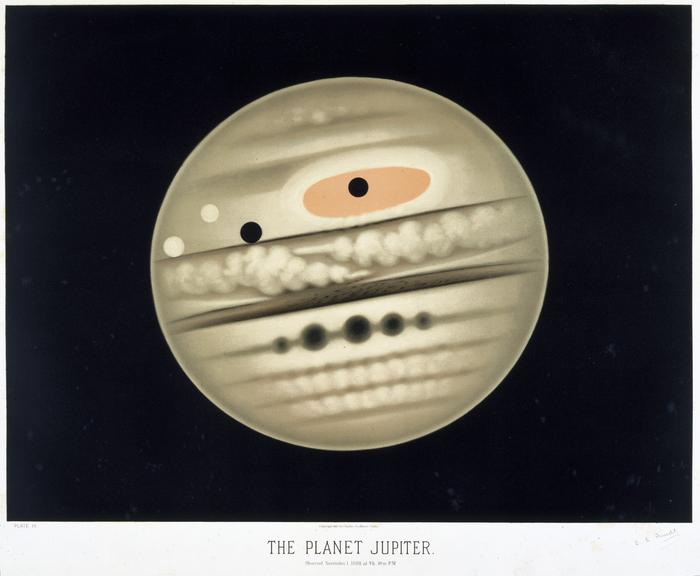 Since then, many more telescopes have turned towards the Solar System’s biggest planet – this beautiful lithograph by Etienne Leopold Trouvelot, part of a series he made at American observatories, shows how Jupiter appeared on 1 November 1880.