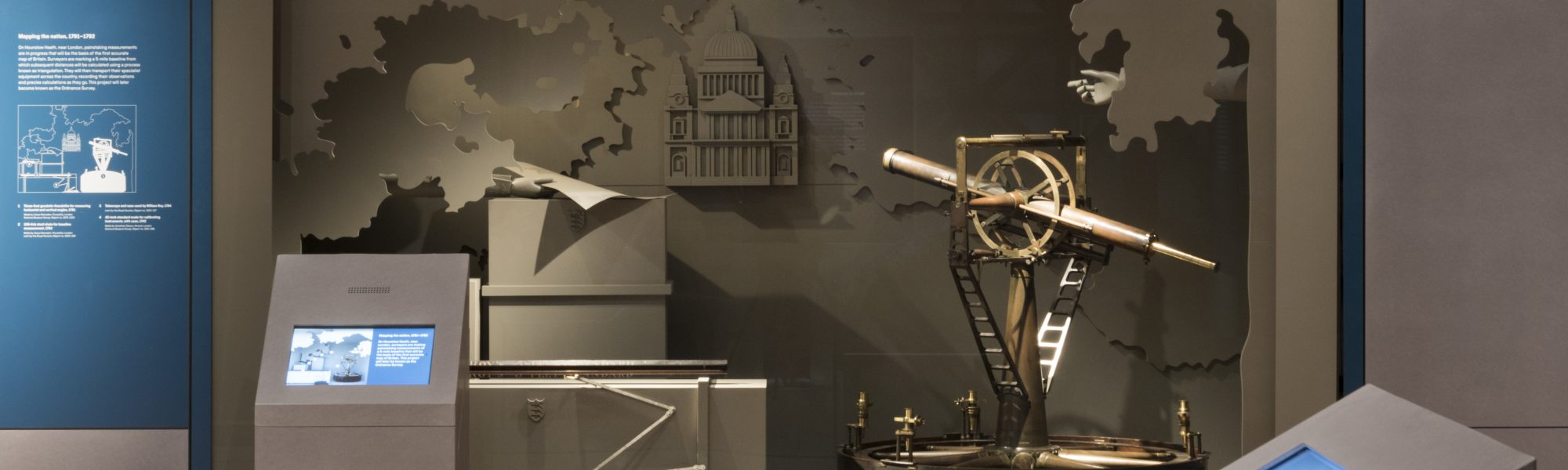 The theodolite is part of a diorama-type scene, of which there are several in the gallery. In the scene, the instrument is displayed next to other objects that were used to create the first accurate maps of Great Britain in the late 1700s.