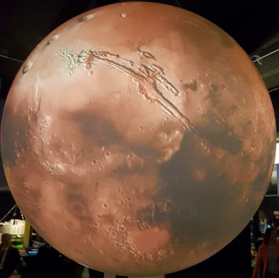 Today the red planet has been visited by a flotilla of spacecraft flying past, orbiting or even landing, and most returning ever-improving imagery. The Science Museum’s new ‘Planet Science’ display projects just one of these scenes: a glorious whole-world rendition of Mars showing ice caps, the Valles Marineris canyon – ten times the size of Earth’s Grand Canyon – and other surface features. The image is projected onto a white globe suspended in the Exploring Space gallery. The image itself rotates presenting the impression of a mini-Mars floating in space.