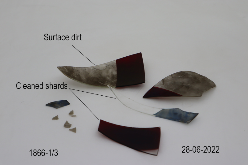Three pieces fit together and the other two slotted together perfectly. When the fragments had been put together with a conservation adhesive and left to cure, the task of matching them to the broken glass bowls of the harmonica could be undertaken. Much to my delight, the adhered fragments fit perfectly into two of the broken bowls.