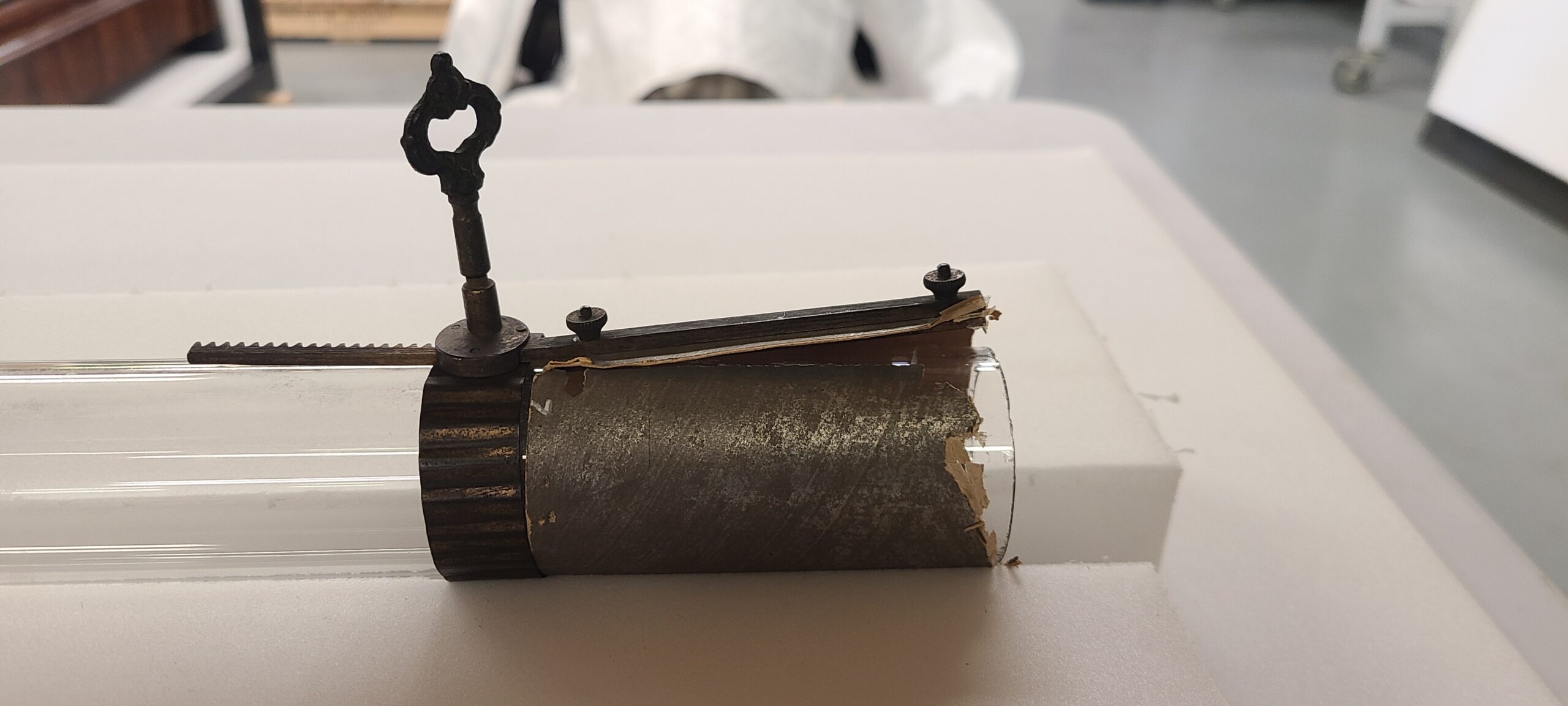This beautiful object also brought me the biggest challenge when it came to conservation as some of glass tubes were unfortunately damaged. The most significant damage was to a metal bracket that held a delicate paper tube in place. The bracket had bent back to a 90-degree angle and ripped the paper from the glass tube.
