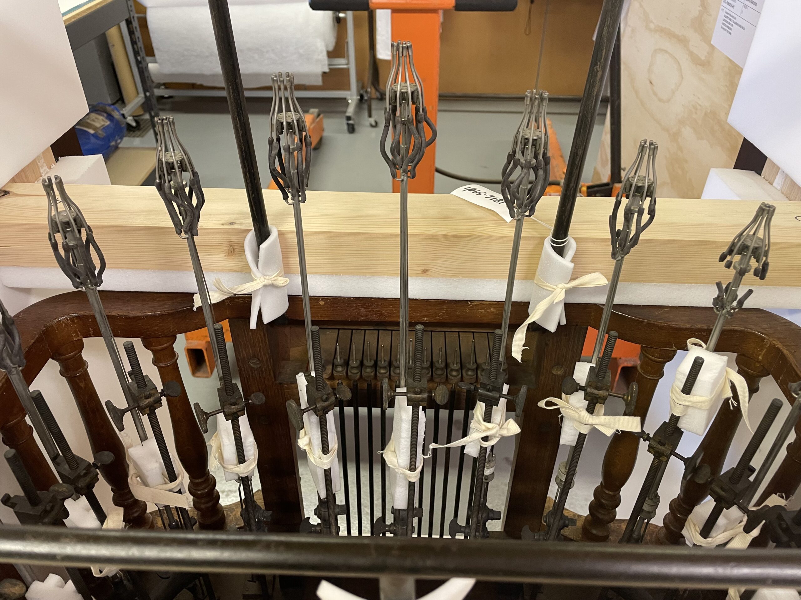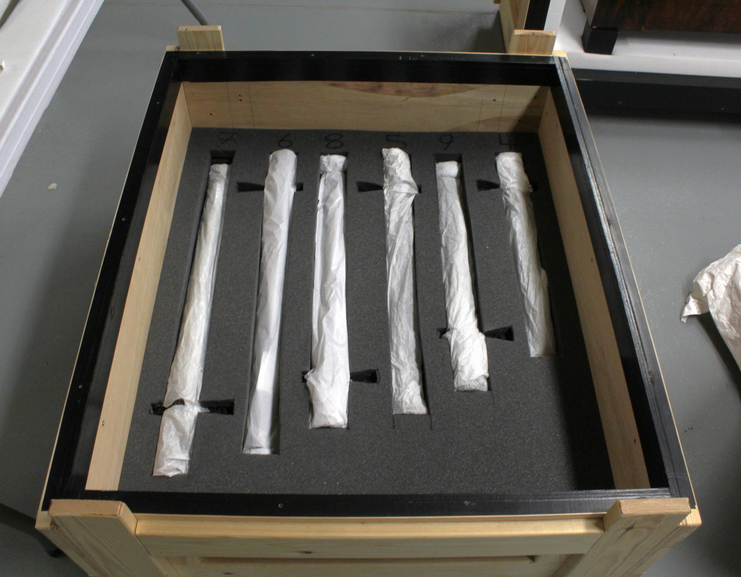 Once the conservation was complete, our team packed the glass tubes and pyrophone body into two separate crates. The thirteen tubes being the most delicate components were individually fitted into numbered foam slots. The fire rods were also very delicate and the bulbs that shot fire were brittle and prone to break off with any excessive vibrations. Therefore, each rod had to be padded and secured to minimise vibrations during transport.