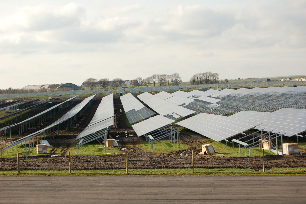 The solar farm contains multiple rows of arrays, each containing photovoltaic panels on a steel and aluminium framework like a giant Meccano set. For the UK, the panels are mounted at a 20 degree angle to optimise power output.