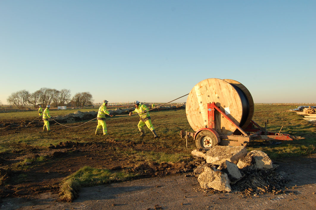 The electrical works for the solar farm are more complex. When running, the PV panels generate electricity, producing it as direct current (DC). This is transmitted via large DC cables to a central inverter station, where it is converted to AC (alternating current). This passes through a step-up transformer, which increases the voltage to 33,000V, ready for the electricity to be transported over the National Grid (and helping minimise transmission losses).