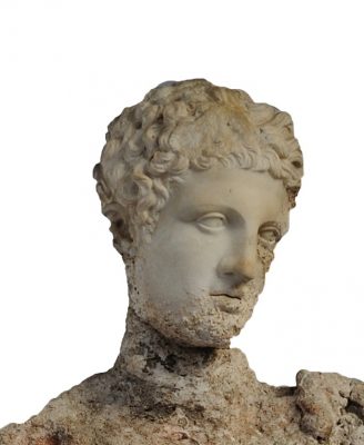 The Aegean Sea eroded the body of the large sculpture, when the boat carrying it along with many other works of art sunk during a storm in the 1st century BC, near the Antikythera Island. Yet, the beautiful face with small eyes, long nose, half-open lips, and crowned by the short hair-locks, remained protected in the sand. A wonderful head of the young god, the “most Greek of all the Olympian gods”.