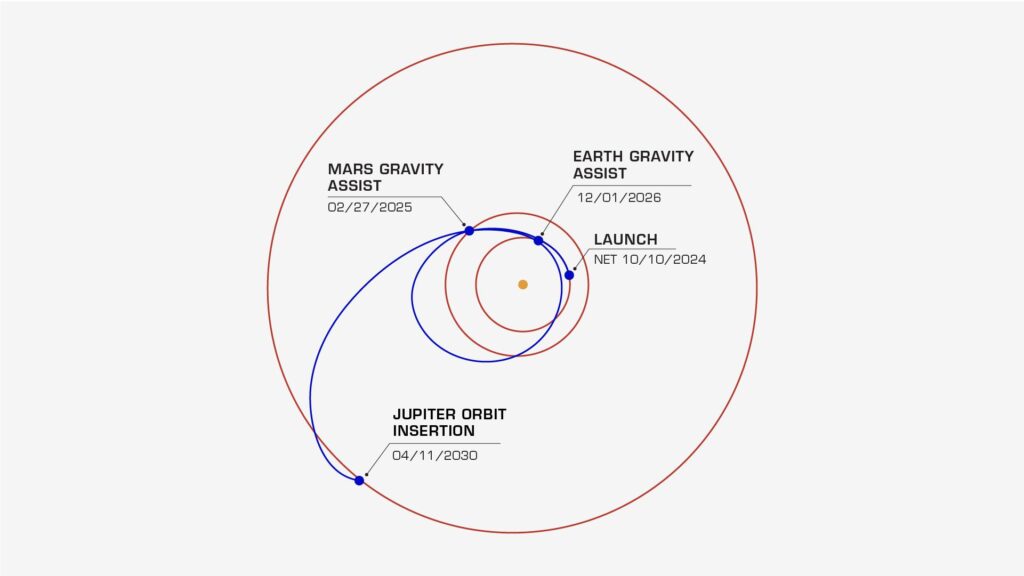 These gravity assists enable the Clipper flyby to be close enough to use Mars and Earth’s gravity to accelerate towards Jupiter. The spacecraft will then spend 3 years conducting almost 50 flybys of the moon while in Jupiter’s orbit, as close as 16 miles from the surface and sending data back to Earth.