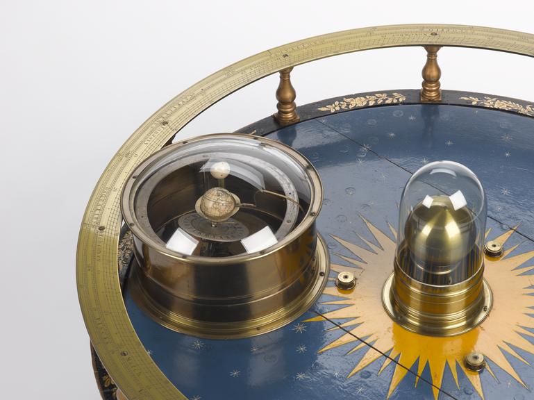 This colourful device is a type of planetary model, used to show the motions of the Earth and Moon around the Sun. By winding a handle on the side of the model, the Earth would be set into motion, turning on its axis around the Sun, with the Moon doing the same around our planet. Models like this became popular during the 17th century, especially after Sir Isaac Newton published his theory of gravity.