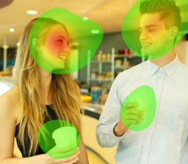 The colours show the areas they were interested in when looking at the picture. Red shows the area of most interest, cooling down to green where they briefly moved their eyes around. You will notice that they have not looked everywhere in the picture, but have focused mainly on the people’s faces (particularly around the girl’s eyes), and the two cups they are holding.